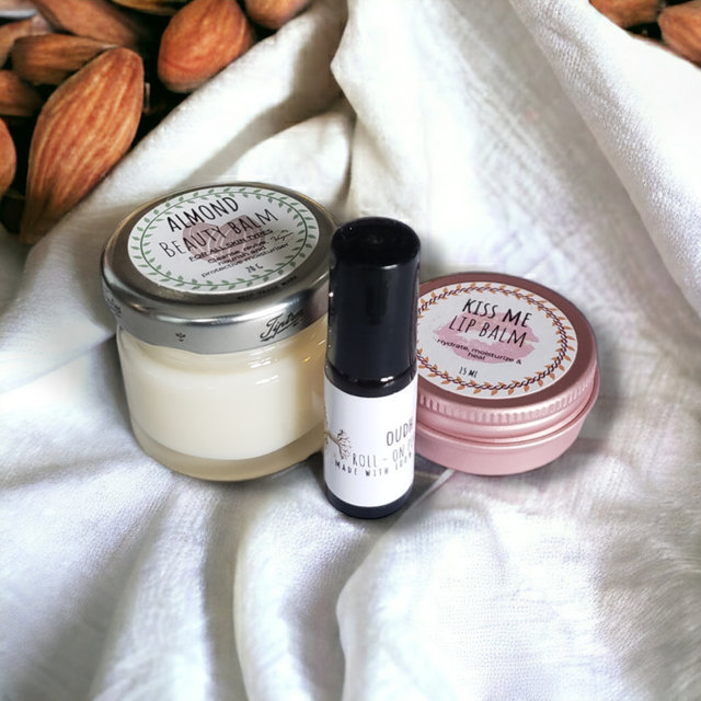 Almond Balm, Sweet orange lip-balm and Oudh roll-on - 3 pieces